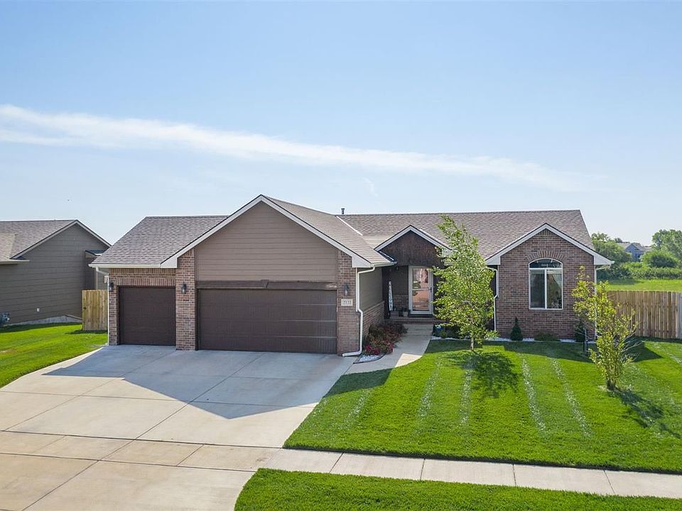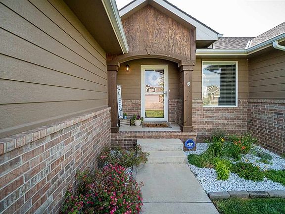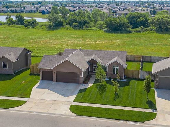 Beautiful custom home off a wooded tree lot with 5 full bedrooms, 3 baths, 3rd car garage, New Roof AND within the Goddard School District! This home feels like new construction and is literally stacked with all the extras including irrigation well, sprinkler system, wood privacy fence, landscaping, split bedroom floor plan, durable luxury wood look vinyl planks carried throughout most of the main floor, designer greige paint, open floor plan concept, double vanity sinks in master bath and backyard that faces the east! All of your kitchen appliances are provided for you, carpets professionally cleaned and HVAC just recently serviced! Home features main floor laundry, wet bar and outdoor deck perfect for dinners and relaxation. Backyard is huge offering room for playground, trampoline and firepit if so desired. Gorgeous home with all the updated finishes and extremely well kept! Now is the time to make your next important move!