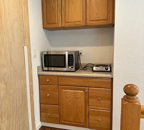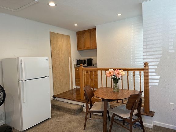 Studio is attached to the main house, but is private with its own entrance. Studio has its own refrigerator, microwave, hot plate but not a full kitchen.