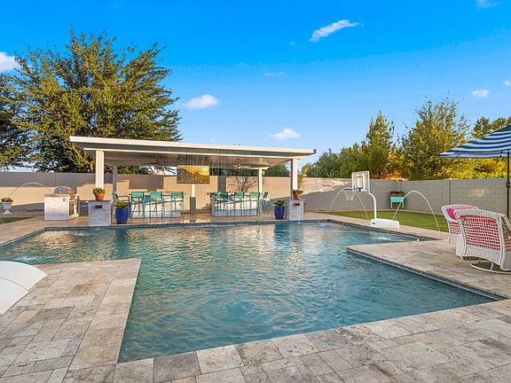 Just Reduced! Fully Furnished Luxury Retreat with Designer Backyard Oasis! Step into your dream home—now at a newly improved price! This immaculate, fully furnished single-level estate offers over 3,600 sq ft of thoughtfully designed, open-concept living on a spacious 14,352 sq ft lot. Step outside into your $300,000 custom backyard escape: a stunning new resort-style pool with multiple water features, an enormous poolside outdoor kitchen with BBQ, TV, and 2 enormous fire tables. An oversized covered patio space with dining, multiple TVs and extended roofline extending to the sparkling blue pool. This backyard is AWESOME and is the perfect setting for unforgettable Arizona evenings and weekend gatherings. Inside, you'll find a bright, modern layout featuring brand-new flooring... granite countertops, a chef's kitchen with oversized island, walk-in pantry, built-in sports bar, and premium stainless-steel appliancesperfect for hosting or enjoying everyday comforts. With 4 large bedrooms + a versatile flex room, 3 full bathrooms, and a 3-car garage, this home has room to live, work, and entertain in style. Tucked away in a quiet cul-de-sac with breathtaking mountain views, a fully fenced yard, and just minutes from top-rated schools, brand-new shopping, dining, and entertainment. Offered fully furnished, this turn-key home blends high-end finishes, recent interior and exterior upgrades, and unbeatable value. All that's missing is YOU!