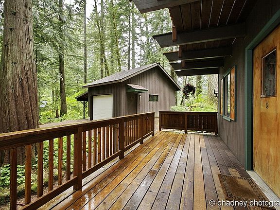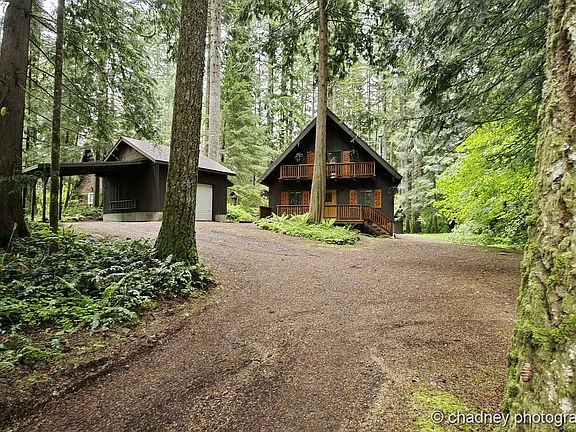 Charming chalet on nearly 1/2 acre, among majestic old growth trees trimmed up for sun light with a private park-like back yard. Cedar sided chalet with charming custom shutters exude old world charm. Oak hardwoods on main flow thru great room w/beams & knotty pine. Newer island kitchen w/pantry. New decks front & back. Balconies off each of 2 bedrooms up. 2nd Bath in master is plumbed only & sold as-is.
