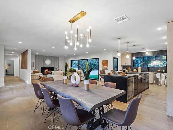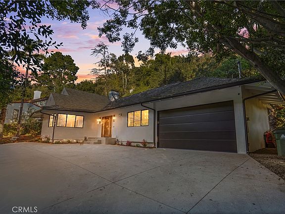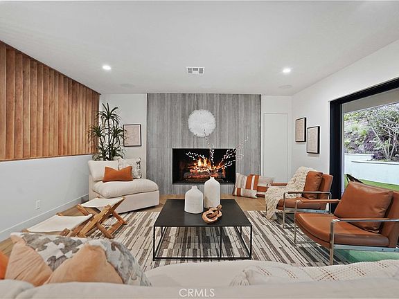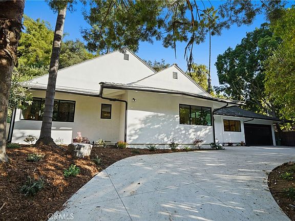 This spectacular newly renovated single story home sits behind a secure wrought iron fence with dual automatic gates. The lush landscape provides privacy and serenity from the busy city. The new presidential circle drive allows for easy access to Coldwater Canyon. This spacious and stylish 3 bedroom, 2.5 bath has many mid-century design elements throughout, from the terrazzo tiled bathroom floors to the birch slat hallway design element. The home features hardwood flooring, custom cabinetry, aluminum windows and doors, designer lighting and plumbing features throughout. The generous great room is perfect for entertaining, with an impressive floor to ceiling gas fireplace, direct access for indoor/ outdoor California living through the multi sliding door. The private Zen like backyard features mature trees, drought resistant landscape, and new turf.