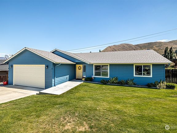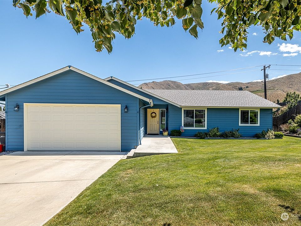 A happy house with everyone's favorite floor plan. Views of the city and river. Separate primary suite with super-sized closet. On the opposite end are two bedrooms and a bathroom. Lovely kitchen with new granite countertops, an island, and stainless appliances. Lots of storage with closet organizers for efficient use. Wonderful patio space made for relaxing evenings. Landscaped beautifully with nice raised beds. Quiet neighborhood in the Squilchuck Canyon with access to recreation and Mission Ridge.