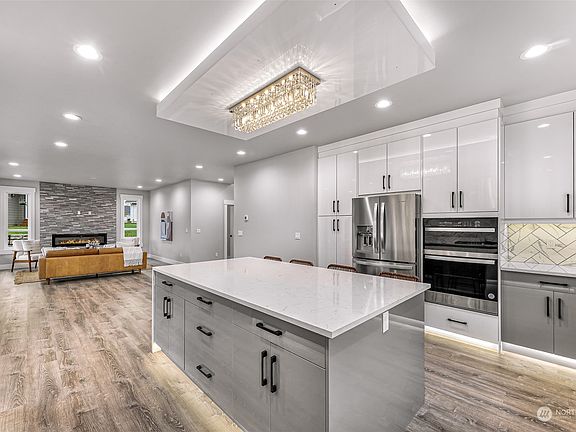New Modern Construction home in Lynden. This Luxury home has 4 bedrooms, 3.5 bathrooms, 2 living rooms, office, 2 primary bedrooms w/ attached elegant bathrooms, walk in tiled showers & walk in closets, the primary bedroom upstairs has a private deck with mountain view. Elegant Kitchen with lots of cabinets, stainless steel appliances, soft close cabinets, Quartz, Spice kitchen with oven, sink, Dishwasher, cabinets. Large Dining area with lower covered deck so you can access your large back yard. stone wrapped gas fireplace in the lower living room, upstairs living room with deck out back that spans the length of the back of the house. House has Solar installed, EV Charger installed, on one of the largest lots. close to Vancouver. Finished