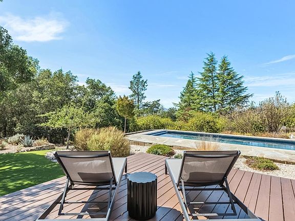 Welcome to your very own Wine Country playground where privacy abounds and up-valley vistas are among the best you'll experience. Framed by majestic oaks and redwoods on approx. 3.36 acres, this contemporary retreat delivers the Wine Country lifestyle with room to relax, gather, and play. Inside, soaring beamed ceilings and hardwood floors set a warm, airy tone. The chef's kitchen boasts granite countertops, cherrywood cabinetry, a pantry, and a sunny breakfast nook overlooking the deck. Two spacious bedroom suites provide great separationone with a walk-in closet and balcony, the other with a light-filled sunroomwhile the versatile loft suits office, fitness, or guest use. Upgrades include a fully owned smart solar system under warranty, enhancing energy efficiency. A two-car garage with extra storage and a wine cellar completes the interior. Outdoors, swim in the sparkling lap pool, unwind in the hot tub, play bocce or horseshoes, and entertain under the open-air pavilion. A broad lawn, fenced garden with fruit trees, and whimsical extrasa treehouse and zip linecreate your own private park. With valley panoramas from many windows, this is indoor-outdoor living at its best. Potential for a vacation rental permit; buyer to verify.
