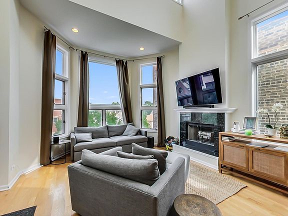 Stunning Chicago city skyline views from this Bucktown duplex up with expansive PRIVATE roof deck! 2 bedrooms PLUS FAMILY ROOM or could be 3 bedroom! Soaring 22' ceilings in living room. Prime Bucktown location: steps to restaurants, stores, 606 trail, parks, metra, EL and expressway! Granite and stainless kitchen with room for dining table. Master bedroom has additional balcony. Hardwood floors and huge windows with south exposure. Family room has city skyline view too! WB Fireplace. Garage parking included with lots of extra storage space. First floor hardwood floors have just been refinished and walls painted. Roof recently replaced (tear off) and new deck.