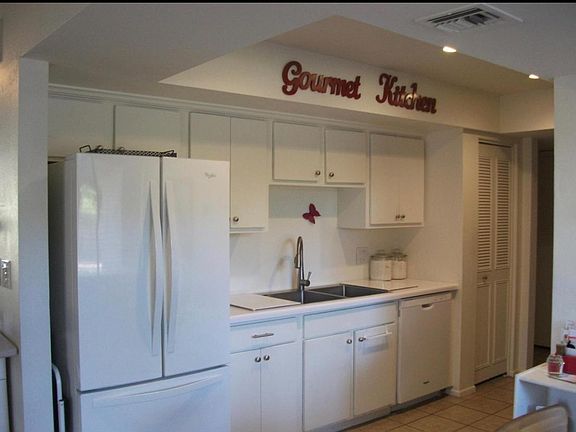 Welcome to a hidden gem in popular Dobson Ranch. It sits on a cul de sac lot backing to one of 7 community lakes and has a larger than average lot. Inside you'll find each bedroom has a walk-in closet. The master bath has a new walk-in shower, double sinks w/ updated vanities and wood look vinyl flooring. Master bedroom is large with French doors to backyard. Kitchen has new white countertops, stainless double sink & updated designer faucet. The Corian moveable counter makes a great work area, breakfast bar and room divider between LR & large dining area in kitchen. French doors lead to back patio with great views of the lake and flowering bushes all around backyard. Don't miss the new garage cabinets, epoxy sealed garage floor and even a tool room w/ workbench. You'll love the friendly neighborhood and convenient location near shopping and restaurants. Community pool, catch & release lakes & kids play areas make this a very popular subdivision. New hot water heater in 2020. New dishwasher in 2019. There will be pet security deposit if you have pets.