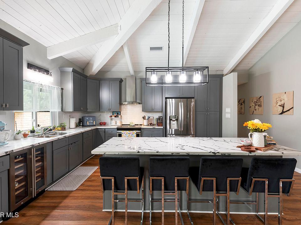 Refreshing poolModern tileSingle storyElegant kitchenCute barn doorNatural lightMaster bedroom