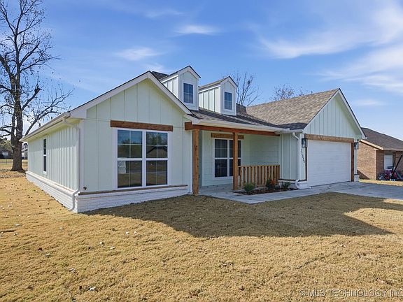 Stunning NEW CONSTRUCTION & NO HOA in Broken Arrow Schools! This beautifully designed Energy Star built home sits in an established neighborhood on a generous & fully sodded lot, featuring covered front and back porch, a grand entry with soaring vaulted ceilings, LVP flooring, and abundant natural light. The spacious open layout includes a gorgeous rock fireplace with ventless gas & gas logs, vaulted ceilings with distressed beams and ambient high/low lighting, and a modern farmhouse kitchen with granite countertops, Energy Star stainless steel appliances, gas stove, white farmhouse sink, bar seating, and coffee bar.