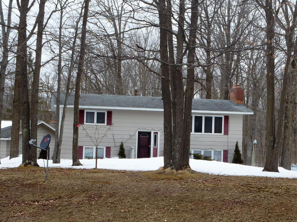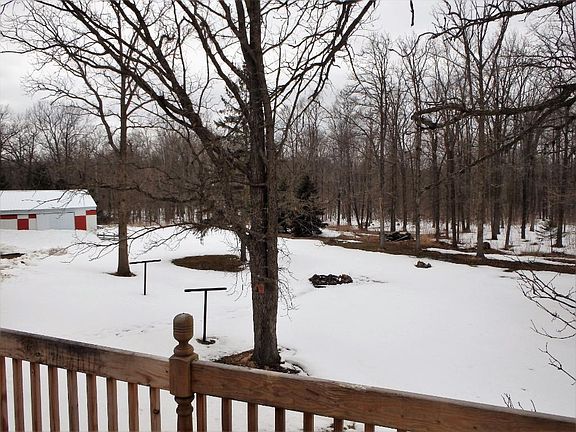 This is a beautiful property. 80% of the trees are oak. Home is on a paved road. Oh that's extra nice! Large deck, look over park like yard! Lower level has mud room that walks out to a large deck that leads to garage. One garage door is 8 ft, the other is 7ft. Cozy fireplace plus wood pellet stove. SS fridge in kitchen will not stay. 40x60 pole barn for your toys. Back on the market sale fell through.