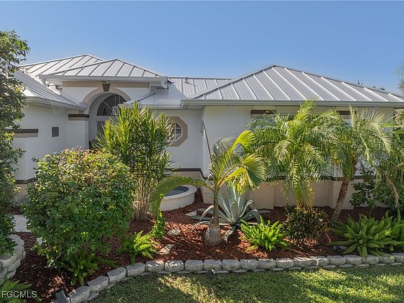 As a great welcome to SW Florida, this home has it all, from a great location in SW Cape Coral to lush tropical landscaping and a uniquely designed home with a courtyard pool, large lanai, and separate private deck with a hot tub and entertaining spaces. Completely updated inside and out, you are welcomed by a tiled driveway with artful grass inserts, a stunning all-glass garage door, a tiled walkway accented with a new fountain, and a custom, oversized front door with keyless entry. The foyer leads to a beautiful, tiled lanai and pool area with home access via the great room and or kitchen, or the separate guest suite with multiple options as in teen suite, in-law suite, or vacation suite. Part of the home was used as a successful vacation rental. Inside the main living area great room welcomes you with a light color palette in the tiled floors and walls. Tastefully furnished and appointed to maximize comfort and functionality. It has lanai access and access to a beautiful deck with a privacy surround, a hot tub, grill, bar and shaded dining and relaxation spaces. A stylish formal dining area sits off the great room and features ample natural light and an attractive white, 3-D feature wall. The kitchen breakfast bar overlooks the great room with seating for 3. Other kitchen highlights feature new high-end white gloss cabinets, new accent handles, a tiled backsplash, white quartz counters, stainless steel appliances, and a large, new Samsung refrigerator with custom facing. The hallway from the kitchen leads to a small coffee nook, the full-sized laundry area, a large closet, and garage access. A light and airy primary suite sits off the great room with gray wood look tiled floors, light gray walls, a walk-in closet, with primary bath with a separate tub, a walk-in shower, a dual sink vanity, and lanai access. A full guest bedroom, linen closet, and updated guest bath with a full walk-in shower complete the interior spaces. The lanai and pool area have been updated with an outdoor kitchen, including a full-sized refrigerator and multiple areas for relaxation and entertainment. The area also includes access to the perfect guest suite, which features a large bedroom, full bath with tub/shower, single vanity, and pool access. All the work has been done on this home, including a new metal roof, all new windows and doors, exterior and interior painting, landscaping with many palm trees and lighting, lawn sprinklers, a tankless water heater, solar panels (significant energy savings), and more! Home is available as furnished and/or turnkey for additional consideration. Close to all shopping, dining, entertainment, boating, and beaches, nothing is missing except you! Make the call today and see this fantastic home for yourself!
