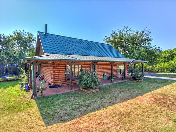 Spacious, highest quality slab, custom built log home nestled at the end of the street on 4.5 acres, featuring large, locally grown black walnut trees, inclusive of a huge 40' X 22' metal barn with a shop and loafing sheds, as well as a storm shelter near the home. The property is completely fenced and has a running creek with a wooden bridge, and covered parking for up to 10 vehicles or a large RV. Amenities inside include custom made honey pine cabinets, trim, bookcases, walk in closets, 2 bedrooms downstairs & huge en suite upstairs, rough red cedar gables, Italian ceramic floor tile, T1-11 knotty pine tongue and groove walls and ceilings, 11 ceiling fans, a Hastings pellet stove with a blower, shelves over every window for displays, and the ultimate 8' X 42' man cave or home office. Outside, enjoy the large wrap-around porches and peaceful country living, plus the private 16â X 16â deck. Centrally located with easy access to Norman, Moore, Oklahoma City, Mustang, and Newcastle.