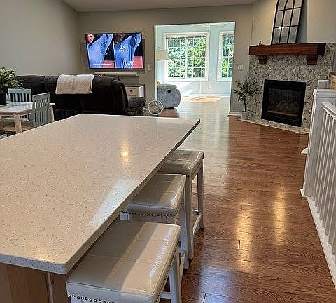 Hard to find in highly desirable Maple Grove condo built in a prime location loaded with space and new amenities. End unit the condos is well insulated between units- never hear your neighbors. Beautiful setting with woods and privacy in the backyard. The living area has hardwood floors, lots of natural light, in the open concept floor plan with cathedral ceiling, skylights, new recessed lighting and sun room. The entryway has new tile, and there is a bonus room with French doors-you choose-office/den/bedroom. The Kitchen: new granite counters, and tile backsplash. Seating area on new custom peninsula along with a new large custom Island with additional seating area and storage. The dining area has a bay window, living room with built-ins and fireplace. Sunroom: a new Shiplap ceiling that leads to the private deck with lovely wooded views.