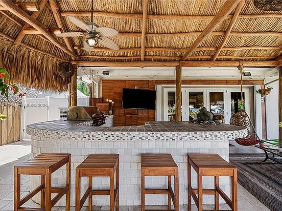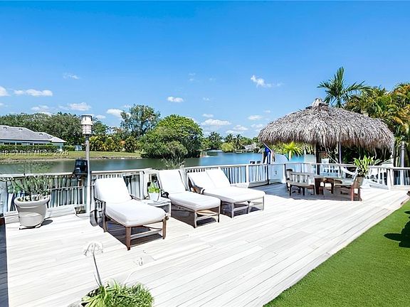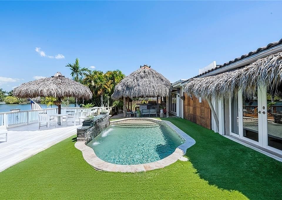 Discover true lakefront living in this beautifully upgraded 5BR/3BA home. Elegant 24x24 marble floors flow throughout, with wood flooring in the office and full impact glass windows and doors. The updated kitchen features stainless steel appliances and a modern master bath. Step outside to your private paradise with a tiki hut, electric fans, outdoor kitchen, teak dining area, and teak accent walls. Enjoy the soothing sounds of a waterfall, paddleboard or fish from your floating dock, or relax on the sand beach entry to the lake. Additional highlights include a circular driveway and lush tropical landscaping. Located in a top-rated school district and walking distance to houses of worship, this home offers the perfect blend of beauty, comfort, and lifestyle.