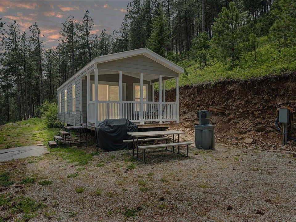 Offered by Jarred Curry, Keller Williams Realty Black Hills – Spearfish | 605-939-0990. Discover 4.38 acres of scenic, forested land near Galena in the beautiful Black Hills of South Dakota. Located just 10 miles from Deadwood, this property has no known covenants and offers convenient access to the Steel Wheel Gas Station, nearby ATV trails and the recreational corridor. The perfect location for Side-by-side and 4-wheeler enthusiasts. Included is a 2018 park model home featuring 2 bedrooms and 1 bathroom, situated on a graded site with ample parking and multiple build sites for building a dream home. The home is supported by a septic system with leach field, and the property is equipped with three RV electrical hookups (110V, 30 amp, and 50 amp). Also includes a water tank seated in a pickup box trailer at the peak of the lot for natural water pressure along with elevated areas with beautiful views of the surrounding hills. Enjoy daisies and seasonal wild raspberries throughout the property. Whether you’re seeking a weekend retreat, an investment opportunity, or a quiet basecamp for outdoor adventures, this peaceful setting offers a unique chance to own in the heart of the Black Hills.