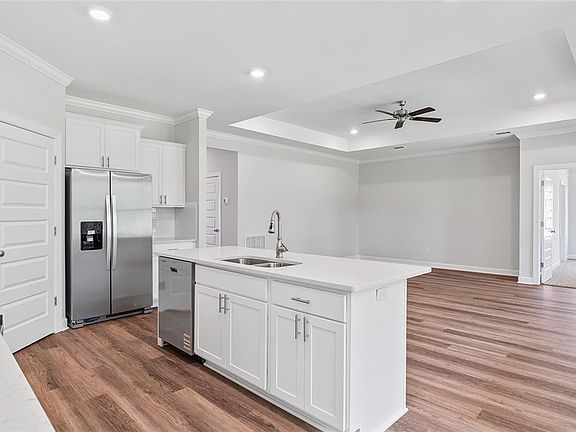 Welcome to 2129 Bluebird Drive in our Preserve community. The Madison, a new home floor plan at The Preserve Community in Auburn Alabama. The Madison is one of our many featured one-story homes at the beautiful community. When you walk into the home, you are greeted by a long hallway that is the center point for bedrooms, the laundry room and garage, and leads to the open living room and kitchen. Beautiful LVP flooring lines the main areas of the house and soft carpet covers the bedrooms. The bedroom closest to the garage also comes with it’s own bathroom, not shared in the main hallway. The bathrooms have beautiful white quartz countertops and shaker style cabinets that enhance the beauty of this home. Entering the kitchen and living room area, you will notice plenty of natural sunlight illuminating the main area. The living room has tray ceilings that open the room, making your living space feel much more comfortable. The kitchen has stainless steel appliances and comes with beautiful cabinets. The large island has plenty of storage in it and every surface has elegant white quarts countertops. The dining area is located by the back door leading to the covered rear patio. Walking into the large primary bedroom, you will also see tray ceilings and three windows that wash the room in natural sunlight. The primary bathroom has a spacious double vanity with white quartz countertops. The walk-in closet is in the bathroom as well, perfect for when you get out of the separate tub or shower with glass doors. Like all homes in The Preserve, the Madison includes a Home is Connected smart home technology package which allows you to control your home with your smart device while near or away. Pictures may be of a similar home and not necessarily of the subject property. Pictures are representational only. The Madison is a must-see floor plan so schedule your tour today!!