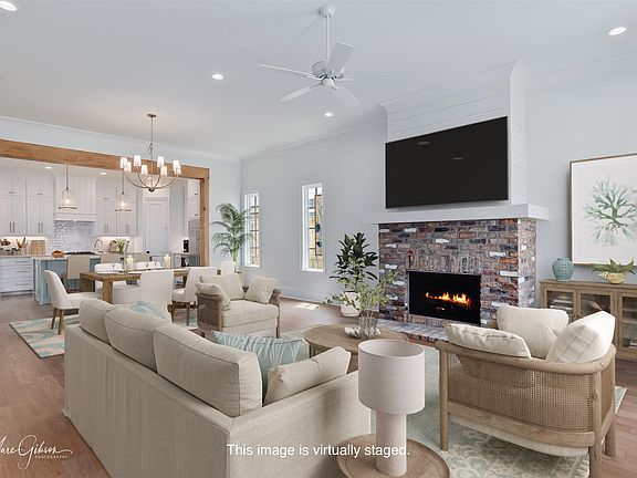 The living room boasts a cozy fireplace with shiplap and painted brick, while the dining area flows into a gorgeous kitchen with a cased timber opening, large island, and walk-in pantry. Enjoy outdoor living year round with a covered front porch and a covered side patio, ideal for gatherings or quiet moments.