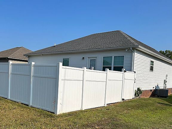 Shaker style cabinetsBrick homeVinyl privacy fenceNeutral paint schemeTile backsplashStainless appliancesGranite countertop