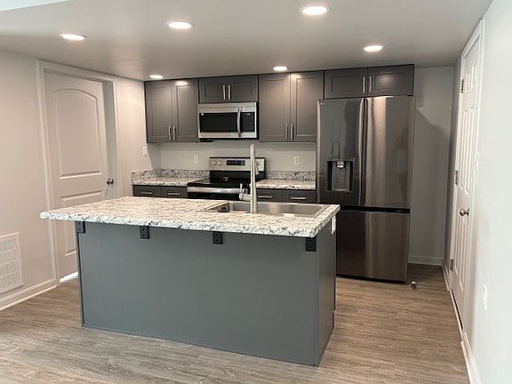 The sleek kitchen is a standout with its contemporary design, complete with a center island, under-cabinet lighting, and plenty of counter space ideal for cooking or entertaining. Spacious bedrooms offer large closets for ample storage, while the attached one-car garage adds convenience and functionality.