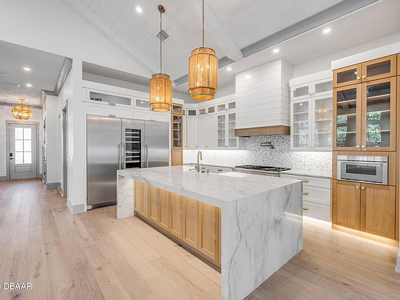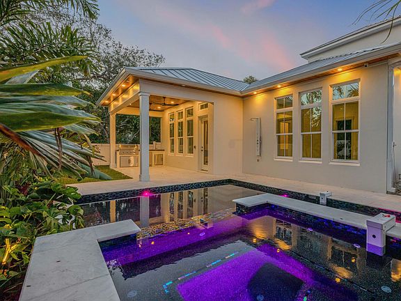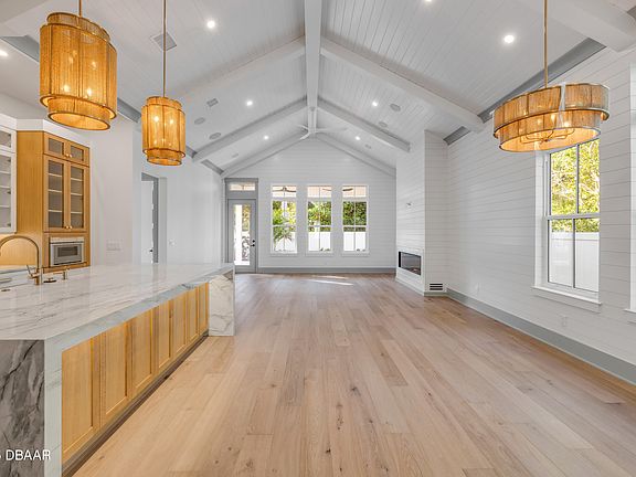 Welcome to a breathtaking year 2025 built beachside coastal masterpiece. It is located deep in the heart of New Smyrna Beach's historic district. This two-story architectural gem harmoniously blends modern luxury with coastal charm, offering an exquisite living experience. Spanning five bedrooms, three bathrooms, and a versatile office/bonus room, this stunning home serves as a true sanctuary of sophistication. The open-concept design is adorned with wide-plank white oak, marble, and porcelain tile flooring, complemented by a custom oak staircase and striking quartzite countertops featuring a four-inch thickened edge. The chef's kitchen is a culinary dream, equipped with top-of-the-line Thermador appliances, including a 42'' range, a three-tower fridge/freezer system, wine cooler, under-counter microwave, and a white quartzite waterfall center island. The luxurious primary suite is a spa-inspired retreat that features a double vanity, deep soaking tub, steam shower, and high-end finishes, creating the perfect escape. High vaulted beamed ceilings enhance the spacious ambiance, while premium impact-rated windows and doors flood the home with natural light. A cozy fireplace adds warmth and charm to the interior. Designed for modern convenience, this fully automated home includes a whole-home generator connection, a custom-made state-of-the-art audio-visual package, and smart lighting that allows you to customize your environment at the touch of a button. Step outside to your personal paradise. The designer pool, featuring a sleek black finish, an 8-person spa with a cocktail bench, integrated amber-lit lighting, and a self-cleaning system, is framed by expansive decking for ultimate relaxation and entertainment. The gourmet outdoor kitchen is perfect for alfresco dining, equipped with premium appliances to elevate your outdoor culinary experiences. Enjoy a spacious covered balcony and dual front and back porches that enhance the coastal Florida lifestyle. A custom-made surfboard mailbox adds a signature touch to the property. The epoxy-finished garage offers a sleek, durable space for vehicles and storage. Located just two blocks to Flagler Avenue, you're steps away from charming boutiques, award-winning restaurants, and the pristine sandy beaches of New Smyrna Beach. Whether you seek a peaceful retreat or an entertainer's haven, this home epitomizes elite beachside living. Indulge in perfectionschedule your private tour today and experience the pinnacle of coastal luxury living.