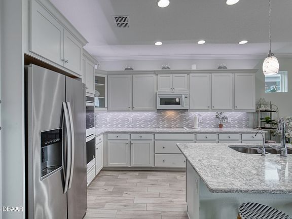 Exquisite Home! PRICED FOR QUICK SALE! Motivated Sellers! This stunning property offers FULL LAKE VIEWS and unforgettable sunsets from your extended Lanai complete with a natural gas line and grill for outdoor dining and entertaining. Inside, you'll find a thoughtfully upgraded layout featuring quartz countertops throughout, an open-concept kitchen with double oven, tile backsplash, and 42-inch soft-close white cabinets with crown molding. The spacious floor plan includes two bedrooms plus a flex room perfect for a home office or guest space. Additional upgrades include tile plank flooring, recessed lighting, crown molding, motorized blinds, and a deluxe primary suite with a huge walk-in shower, Large Cabinets, and huge closet. A whole-house water purification system and reverse osmosis drinking water at the kitchen sink. Located in the award-winning Latitude at Daytona Beach, which is more than a neighborhood, it's a lifestyle. Experience resort-style living with a vibrant town center, where live music, events, and spontaneous entertainment are part of everyday life. Choose from three heated pools, including a tropical lagoon pool, a sports pool, and an indoor lap pool, the private oceanfront beach club complete with pre-set loungers and umbrellas, also available.