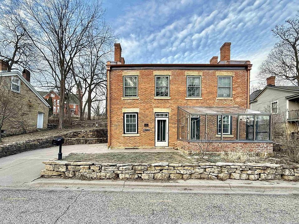 Step back in time with the historic Charles Strongman House, a stunning mid-1800s Federal-style brick home nestled in the heart of charming Mineral Point, just a block from shops and restaurants. Built for a prosperous pioneer miner, this rare gem features local limestone lintels, multi-light transoms, and iconic double chimneys. The home exudes character with exposed stone walls, wide moldings, two original fireplaces, and gorgeous wood floors. Thoughtfully updated with a modern kitchen boasting stainless steel appliances and granite countertops, refreshed baths, refinished wood floors, new interior paint, and updated lighting, it seamlessly blends timeless charm with contemporary comfort. A detached garage offers the perfect space for an art studio or workshop. An ideal vacation rental.