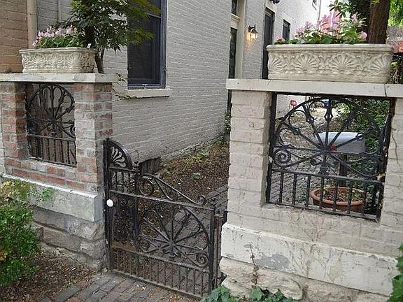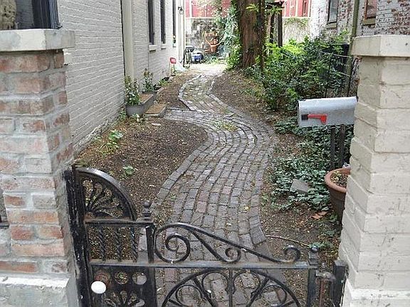 1-bed 1-bath on a quiet brick-paved street that features a gated courtyard, stained glass windows, hardwood floors, exposed brick, 2 fireplaces, 10.5' ceilings, 9' windows, french doors, and other vintage details.