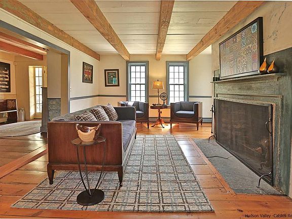 Stunning antique farmhouse located in the picturesque town of Olive NY. This renovated 4 bedroom 2 1/2 bath home is beautifully sited on 17 acres. Situated on a quiet county road, this one-of-a-kind home is full of character & charm. Vintage wide plank floors, Double Dutch doors, beamed ceilings, and a charming eat-in country kitchen that opens to the large screened-in porch that overlooks the lawn and stream beyond. This home has 4 fireplaces, located in the living room, dining room, den, and master bedroom, to keep you cosy on a chilly evening. A gorgeous pool area, complete with a heated pool, gunite in-ground hot tub, waterfall garden, and a pool house with all the amenities. The red rustic barn, established landscaping, and curved drive make this home picture perfect. Whether you're relaxing by the pool with friends in the Summer or reading by the cozy fireplace in the Winter, this is the oasis you have been looking for. Explore the areas numerous farm stands, restaurants, breweries, orchards, hiking, biking, and antiquing. All of this only 2 hours from NYC, 10 min. to Stone Ridge NY, and 20 min. to Woodstock NY.