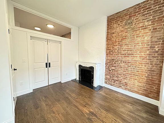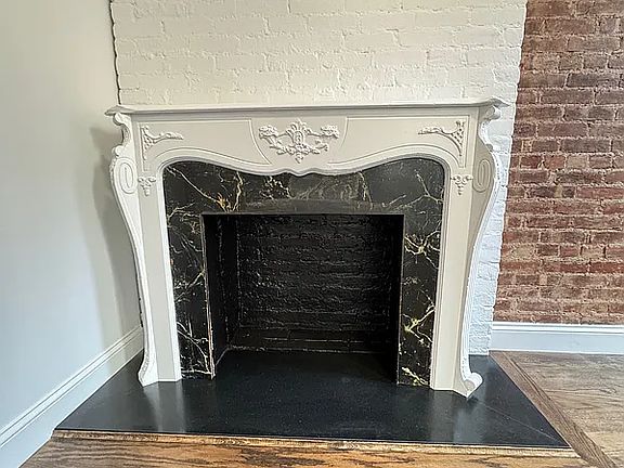 Faux fireplaceExposed brickGe fridgeSoaring ceilings