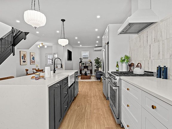 As you enter, you're greeted by a gorgeous archway that leads to an open and functional parlor floor. The large chef’s kitchen is a true highlight, featuring an expansive 8-foot island with beautiful water edges, perfect for seating four people. It’s complemented by white shaker cabinetry, top-of-the-line stainless steel appliances, and ample counter space for all your culinary creations. The oversized ceramic farm sink adds a touch of rustic elegance to the space. The parlor floor also includes a formal living room, a cozy dining area complete with a coffee bar, and a convenient half bath. A door from the dining room leads to a private back deck, ideal for outdoor relaxation.