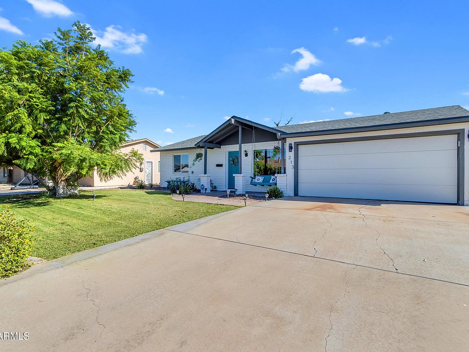 Step outside to your private backyard oasis, complete with a sparkling pool and grassy play area, perfect for Arizona living. The garage includes a 220-outlet charger - ideal for electric vehicles or a home workshop.