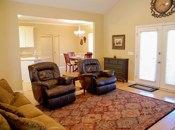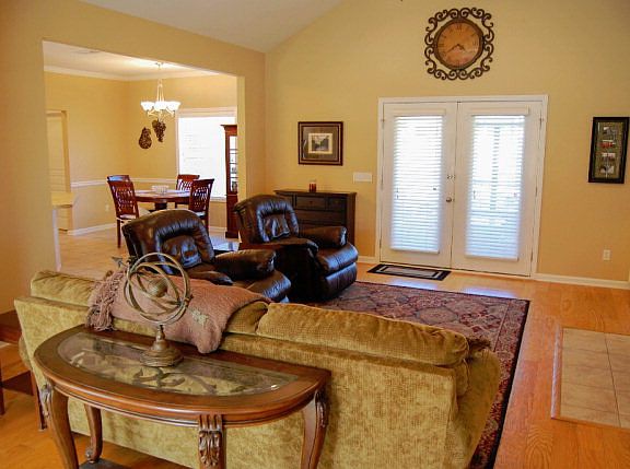 This brick home in Homestead subdivision is priced to sell! Living area features vaulted ceiling, fireplace with attractive mantle, built-in bookcase, and French doors leading to the large screened patio overlooking a huge fenced backyard. The kitchen is open and tiled (all appliances remain). Wood floors flow to a formal dining room currently used as a den. The master suite offers an en suite bath with dual sinks, separate shower, and jetted tub. Neighborhood features sidewalks and common area!