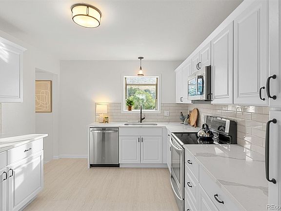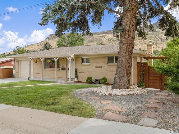 Hilltop Retreat with Panoramic North Table Mountain Views. Perched above Golden, this beautifully updated ranch-style home offers uninterrupted views and is just minutes from historic downtown. Enjoy easy strolls to shops, restaurants, breweries, and top-rated trailheads like North Table Mountain and Golden Cliffs. Originally built in the 1960s, this home blends brand new modern upgrades with preserved retro charm. The main level features a bright, open living room with original oak floors, an oversized window, and seamless flow into the newly remodeled kitchen boasting all-new GE appliances, tile floors, backsplash, cabinets, counters, and sink. The fully renovated walk-out basement offers a versatile family room with wood-burning fireplace with updated stonework, and sliding glass doors to the backyard. A private primary suite features double walk-in closets, faux beams, newly updated electrical, and a luxurious five-piece bath with soaking tub, double-head shower, new vanity, countertop, and toilet. A non-conforming bedroom makes an ideal office, gym, or studio. Set on a rare double lot, the fully fenced backyard is perfect for entertaining, gardening, or simply soaking in the mountain views. With potential for an ADU, plus an oversized 1-car garage with storage or workshop space, this Golden retreat combines charm, location, and opportunity.