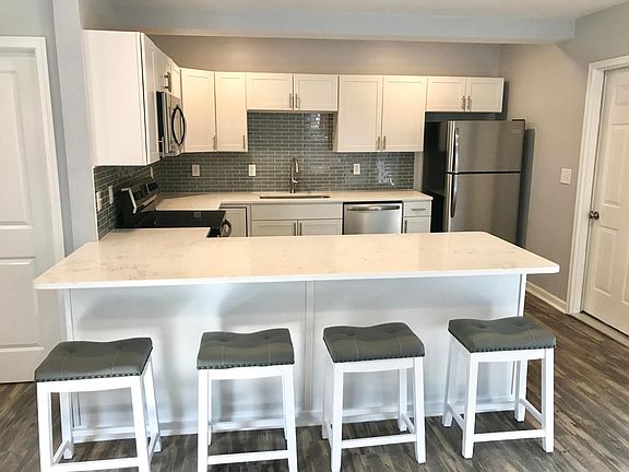Walk in to a spacious Living room connecting to a beautiful kitchen with island that seats 4, quartz counter tops, glass tile backsplash and stainless steel appliances including over the range microwave, dishwasher and full size fridge.