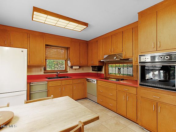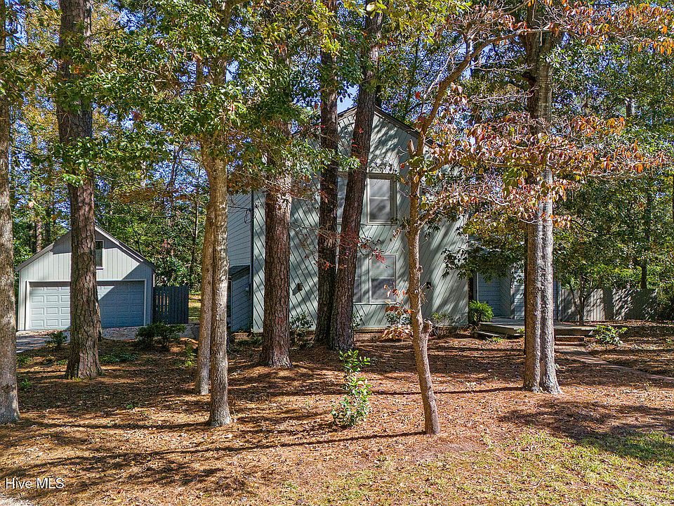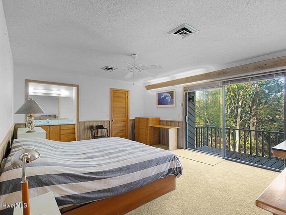Tucked in the charming Mitchell Village neighborhood, 213 Larkin Street is a lovingly cared-for 1970s home offering classic mid-century elements and an inviting, tree-lined setting that feels private and peaceful from the moment you arrive. In the living room, find soaring vaulted ceilings and a brick fireplace flanked by floor-to-ceiling windows framing the lush greenery outside, creating a cozy space perfect for entertaining, movie nights, or rainy-day reading. Natural light filters through large windows and sliding doors leading onto a spacious deck and into a backyard oasis with mature trees, a pond, and the perfect spot to hang a hammock. The kitchen features original dishwasher, oven, and trash compactor, and updated refrigerator, cooktop, and range hood, along with plentiful cabinetry and a charming pass-through to the dining room, flowing seamlessly into the living room. A half bath, large flex room, and utility closet with a water softener complete this floor. Upstairs, the primary suite offers an ensuite, walk-in closet, and private balcony overlooking the backyard—a tranquil perch for sunrise coffee or enjoying the evening breeze. A darkroom closet for photographers or hobbyists offers creative use or storage, with understair storage as well. Two additional bedrooms feature double closets, and a spacious full bath completes the second floor. The large driveway leads to a detached 1.5-car garage, offering storage above and a workshop, while the brick patio and deck effortlessly expand the living area outdoors. With original 1970s features ready to be appreciated or elevated, this home is an incredible opportunity to bring your vision to life. Whether you're drawn to the mid-century modern personality, cozy spaces, or the lush, peaceful setting, 213 Larkin combines comfort, charm, and privacy in a convenient location close to the community park with sound access, grills, and a playground, and everything else the Crystal Coast has to offer.