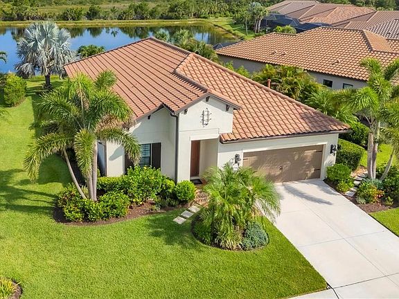 DON'T WAIT TO SEE THIS MAGNIFICENT HOME BEING OFFERED NOW!! Located on a short cul de sac street with little drive through traffic. Boasting a GORGEOUS LAKE VIEW from the extended pavered lanai with SPECTACULAR SUNSETS! Large lot has been transformeed with tropical trees and landscaping to create a peaceful and serene tropical oasis. Perfect for watching wild life. Inside this beautiful home you will find a great room open floor plan with 18" PORCELAIN TILE throughout main areas of home and hardwood in the den up front. Loaded with upgrades this home also features crown molding, tray ceilings, designer fans and fixtures, 4" PLANTATION SHUTTERS and 8' Doors throughout. Kitchen shines with upgraded cabinets, under cabinet lighting, extra recessed lighting, Zodiac counter tops, tile backsplash, stainless steel appliances, and the stove is GAS run for those chefs in the family. Gorgeous Lake views from all main rooms and master bedroom. Let the inside and outside flow together with POCKET SLIDERS TO LANAI. Lanai is pavered ( along with front walk) and extended, with CLEAR VIEW SCREENING to showcase the lake and tropical landscape. Night time is special with outside lighting to make your surroundings glow. If you are tired of the sunshine, there is a RETRACTABLE AWNING WITH LIGHTS, and a RETRACTABLE SIDE SCREEN for shade if desired. Back inside again, property offers 3BD/3BA/DEN. The extremely spacious master bedroom en suite has plenty of room for a king size bed , night stands, and a separate sitting area for reading or watching TV. En suite master bath offers dual sinks, walk in shower, 2 closets and linen closet. Two Guest bedrooms at other end of home for privacy. Guest bedroom 2 has an en suite bath also, perfect for longer staying guests. Separate Den/Office for those who want to work in the home. Eastern exposure in front provides tons of natural light to work with and you can shut the world out with GLASS FRENCH DOORS while still keeping an eye on the comings and goings. Also featured is a whole laundry room with wash sink and hanging/storage racks. 2 Car garage with wall mounts and storage racks. NO REASON TO WORRY ABOUT HURRICANES, HOME WAS BUILT WITH HURRICANE IMPACT WINDOWS AND PROPERTY COMES WITH WHOLE HOUSE KOHLER GENERATOR IF THE LIGHTS DO FLICKER. Electrical system was upgraded. Check out the 3D walk through tour at: https://my.matterport.com/show/?m=vVBf6oLXSd6 Milano is a FANTASTIC GATED COMMUNITY, offering Clubhouse, heated swimming pool, picklball courts, tennis courts, bocce ball, Fire Pit gathering area, dog park, and Myakka River Nature Trails for walking. LOW HOA'S. NO CDD. Located minutes to Downtown Venice, Venice Beach, shopping, restaurants, theaters, outdoor activities, Nokomis Beach, Casey Key, and so much more. The new shops and Atlanta Braves spring training facility is not far away. Up in Sarasota visit the many sights to see at Mote Marine, Selby Gardens, Ringling Museum, and a thriving art center on Main St. Sarasota Airport is just a short drive along with the UTC Mall and shops. Highways are just around the corner. COME SEE THIS BEAUTIFUL HOME NOW BEFORE IT IS GONE!!