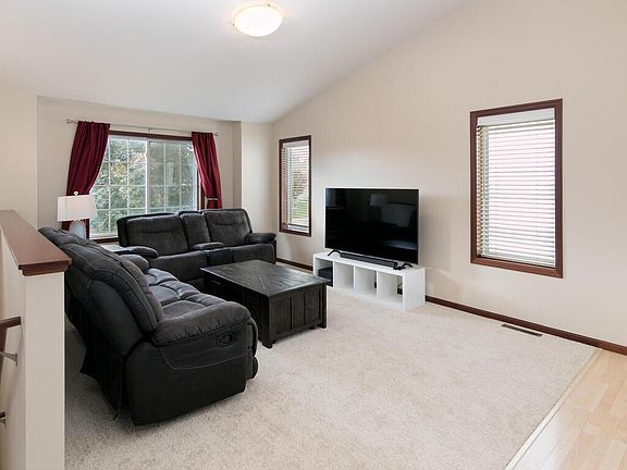 Retreat to the primary bedroom, which features a walk-in closet and a convenient walkthrough full bathroom. The lower level offers a cozy family space complete with a corner stone gas fireplace and a walk-out sliding door to a concrete patio, perfect for enjoying the outdoors. This level also includes two additional bedrooms and another full bathroom, providing ample space for family and guests. Other notable updates are fresh paint, new carpet in living room, hall & stairs, new furnace (2024), washing machine, water heater (2023), and sealed driveway.