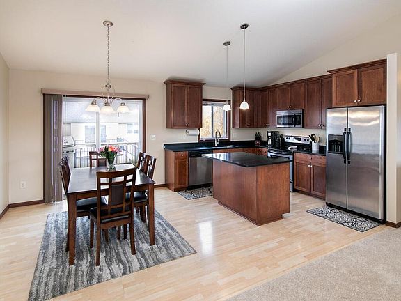 The heart of the home is the beautiful kitchen, showcasing cherry wood cabinets, black granite countertops, and stainless steel appliances. The center island doubles as a breakfast bar, making it the perfect spot for casual meals or entertaining. Step out from the dining area onto the deck, ideal for summer barbecues and outdoor relaxation.