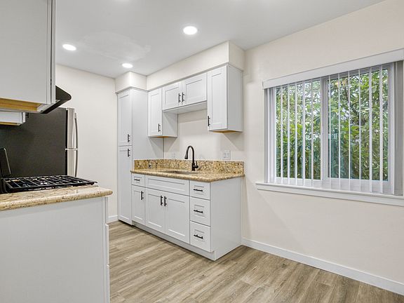 The stylish kitchen includes all-new cabinetry, quartz countertops, a large stainless-steel sink, and brand-new appliances including a gas range/oven and refrigerator. The newly remodeled bathroom offers a tile shower with sliding glass doors and contemporary vanity.