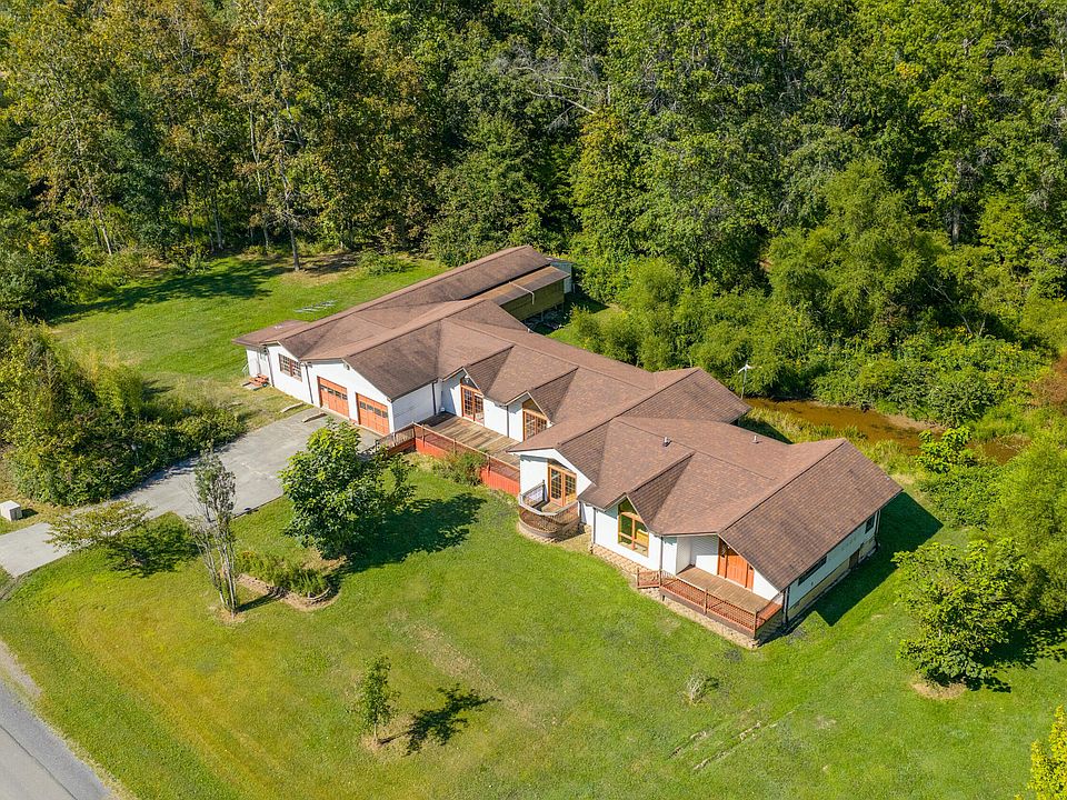 *Showings starts Friday, October 17* Patterson Creek Retreat - Country home on 35+/- acres in western Greenbrier County. This eclectic one-story structure bordering Patterson Creek served as both a private residence and an informal retreat center. Features include living and family rooms, a den, a dining room, two ensuite bedrooms, 6 bathrooms, a back porch overlooking a pond, several decks and an attached 2-vehicle garage.Located 10 minutes from the Dawson exit on I-64, the home was assembled from several modular units. The main section consists of the private residence. The retreat center on the other side of the garage has an open-plan living/kitchen/dining space and three small bedrooms with bathroom facilities integrated in each room. The home's main entry opens into the living room, with hardwood flooring, a peaked wood ceiling, wallpaper and a chair rail.