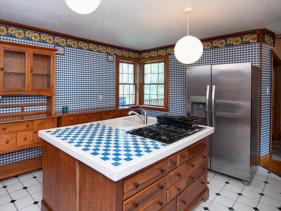 The kitchen has cherry cabinetry and a tiled central island with a double sink and countertop gas range (propane). Appliances include a Frigidaire refrigerator and an Amana wall oven and microwave. Just beyond the kitchen, the wallpapered dining room has a ceiling fan, and includes a table with 6 chairs. The dining area opens to the covered back porch which has a ceiling fan and overlooks the pond.