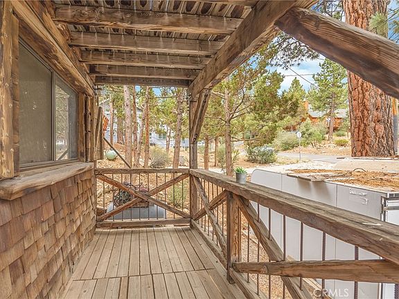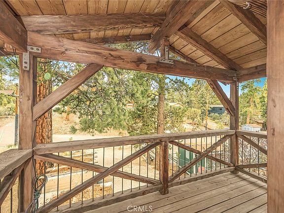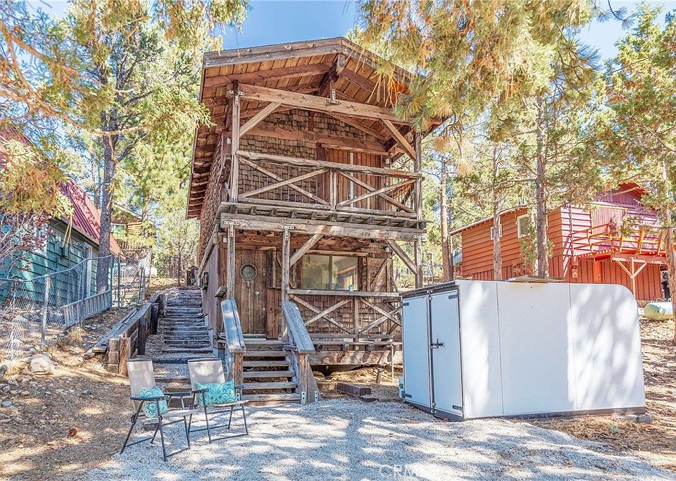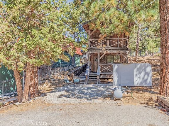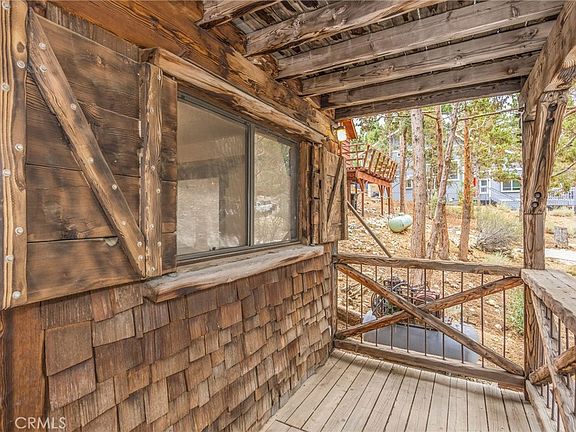 This 2-bedroom, 1-bath cabin on a 2,500 sq. ft. lot, nestled amid mountain beauty and mature trees, blends whimsical charm with enduring craftsmanship—offering a wonderful opportunity for your next mountain retreat or investment. Built as the personal passion project of a contractor/carpenter known for the beauty of his spiral staircases—this home showcases both craftsmanship and integrity. Amazingly thick wood doors pair with commercial-grade lock systems, industrial-style hardware, and a fire suppression system in the rear yard, underscoring a home built to last. Rustic wood and metal details highlight the cabin’s mountain character, with craftsmanship adding warmth and charm. Inside, each bedroom features open wood-beam ceilings, unique light fixtures, and well-sized closets, while the front bedroom opens to its own upper balcony overlooking the front yard. The 2nd bedroom’s double doors provide access to the rear. This home is full of character—ready and waiting for the next owners to add to its special nature with their own vision. A covered front porch frames the yard, and a free-standing locked storage unit offers space for tools, gear, and toys. Good, level parking adds convenience to mountain living, and the home itself is loaded with potential. Sugarloaf’s small-town charm is just minutes away with Kallan’s Bar & Grill, the local park, fire station, post office, and neighborhood market, while Big Bear Lake, ski resorts, and Big Bear's Village with its shops, restaurants, and year-round entertainment are just a short drive. A truly unique property ready for you to make it your own!