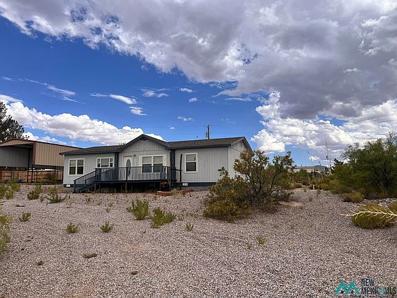 This 3 bed 2 bath manufactured home boasts approximately 1568 sq ft, it has been gently lived in and sits on a nearly 1/2 acre lot. It has an RV carport with electric hook up. Inside features include carpet and tile flooring, open kitchen area with dining area and plenty of cabinets space. Separate laundry room and spacious living room, walk-in closets in all bedrooms. Double sinks and a bubble tub in the master bath. This home is conveniently located close to Elephant Butte Lake. This is a must see!