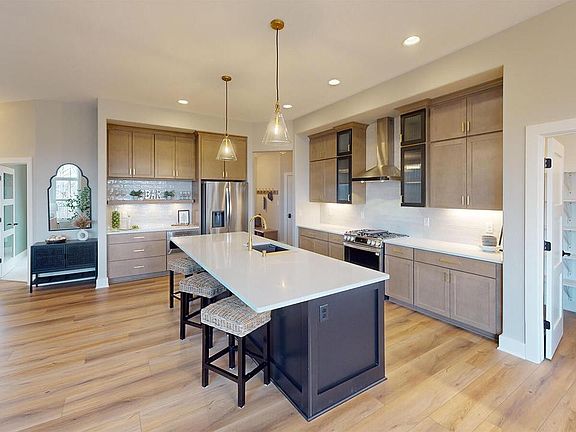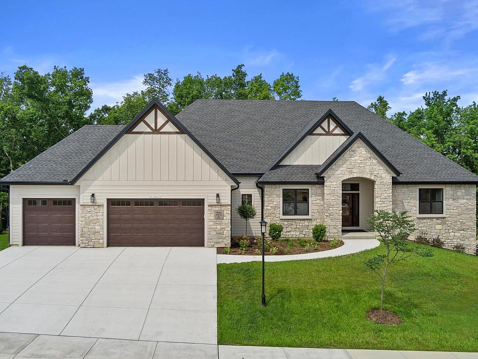 Exceptional curb appeal with striking roof lines and an abundance of stone. Chef's kitchen featuring quartz tops, painted cabinets w/soft close drawers, doors & stacked uppers, under cabinet lighting, tile back splash & conveniently located walk in pantry. Corner gas fireplace w/floor to ceiling stone face. Flex room/Office off foyer. Mstr suite located behind the garage w/private entry, two large wic's, vanity w/quartz tops, 2 sinks, Kohler shower base w/ceramic tile walls. Family bath with Corian counter top w/molded sink, full linen closet & tub w/shower above. Utility/mud room & powder room located off of the garage. LVP flooring in main areas of house. Oversized three car front entry garage. 9' foundation w/exposure, 3/4 bath rough-in. Composite deck.