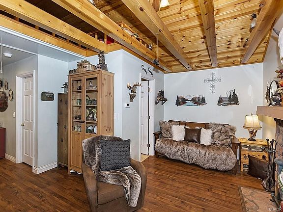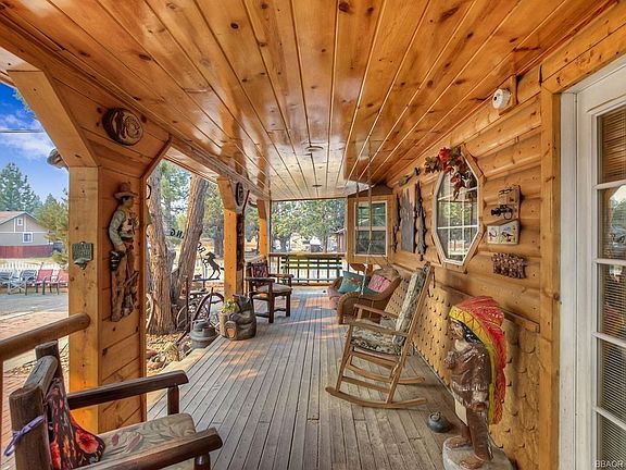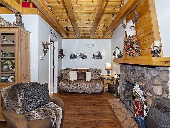 CHARMING LOG CABIN... located in the east end of Big Bear valley on a triple corner lot. 1 Bedroom/1 Bath, approx 416 sq. ft plus a loft not included in sqft. Upon entry from quaint covered front porch, find living room with wood laminate flooring, decorative fireplace with rock hearth, free standing AC unit & central forced heat! Galley style kitchen, spacious, lots of storage, beautiful granite counters. Bathroom features shower in tub, beautiful vanity with under mount sink. Outside find cute fenced front yard with windmill and spectacular view of Sugarloaf mountain!!!!! Entry gate, flat RV parking with hook ups walkway, side yard leads down to backyard, cross fenced, ... great space! Property is minutes to Big Bear Lake and Bear Mountain the NEW Big Bear Zoo, convenient drive to Downtown shopping. All this and double pane windows, to boot! Large yard offers endless possibilities & will be a favorite entertainment destination. Don't put off taking a look, blink and it will be gone!