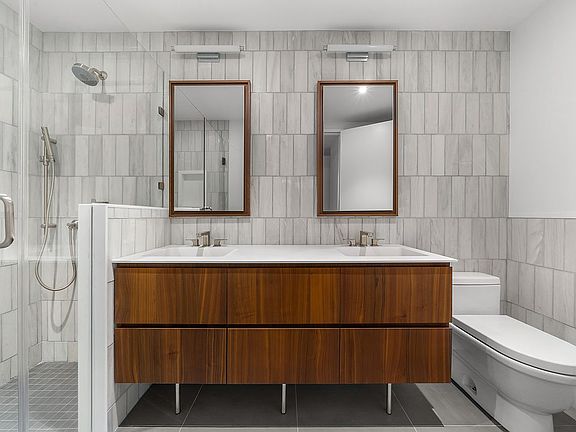 Featuring all the luxuries of a modern home, the residence includes an open, gourmet kitchen equipped with state-of-the-art appliances, wood cabinetry, and a marble, waterfall island. The primary bedroom features a walk in closet, floor to ceiling windows and a spa-like bath with dual sinks, tiled marble walls and top-of-the line fixtures. The sizable secondary bedroom boasts floor to ceiling windows, good closet space and a spa-like bathroom.