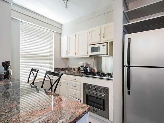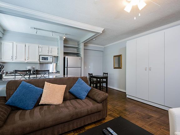 This fully-furnished studio, 1 bathroom condo is on the top floor of a 5-story building on the convergence of Dupont Circle and the West End. The sunny unit features hardwood floors, built-in storage, a gas stove and microwave in the remodeled kitchen, a tub and shower in the remodeled bath, a full-sized Murphy bed for added space, a card-operated laundry in the building, and in-wall air conditioning units. The building boosts a shared roof deck with great views of downtown DC. Restaurants, a Whole Foods Grocery Store, a Trader Joes, and shops are just blocks away. The Dupont Circle (red line) Metro Station is an easy 7-minute walk away, and the Foggy Bottom (blue, orange, and silver lines) Metro Station is just over 10 minutes away. Walk score: 95, Transit score: 92, Bike score: 94.