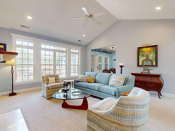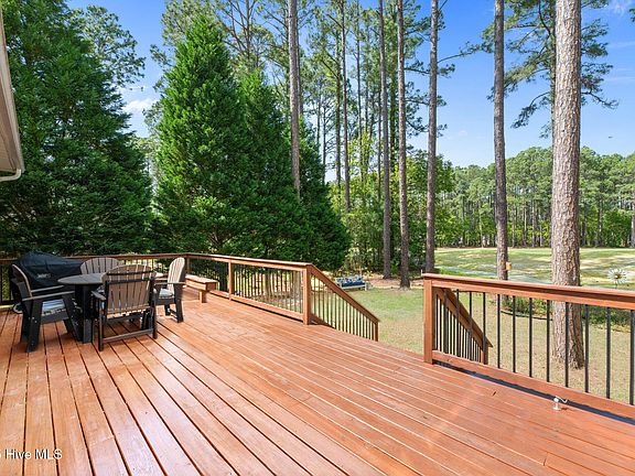 Welcome to this beautifully crafted Stroud Custom Home, perfectly positioned along the 15th fairway of the Harbour Pointe Golf Course in the sought-after, gated community of Fairfield Harbour—just minutes from historic downtown New Bern. Surrounded by serene pines, this meticulously maintained home offers exceptional details and warm Southern charm. A gracious covered front porch invites you in, while gleaming hardwood floors enhance the foyer, kitchen, and formal dining area. The bright open-concept living and dining space is ideal for entertaining, featuring vaulted ceilings, transom windows, custom built-ins, and a cozy gas fireplace. The spacious kitchen is a chef's delight with a gas stove, double oven, pantry, and ample prep space. A bright breakfast nook leads to a tranquil sunroom—perfect for enjoying your morning coffee with a view. Retreat to the generous primary suite with a double vanity, jetted tub, and separate shower. Two additional bedrooms on the opposite side of the home offer privacy for guests—one includes a convenient built-in Murphy bed. A versatile bonus room with charming stained glass sconces provides added flexibility for hobbies or a home office. Enjoy stunning golf course and wooded views from the expansive deck—perfect for relaxing or entertaining outdoors. Additional features include plantation shutters, a floored attic for extra storage, a spacious side-entry 2-car garage, and invisible fence. Fairfield Harbour offers a vibrant coastal lifestyle with access to marinas, tennis and pickleball courts, a restaurant, dog park, playground, walking trails, boat ramp, kayak launch, and a fishing pier. Optional membership at the nearby Broad Creek Recreation Center provides access to indoor/outdoor pools, fitness rooms, and more. Don't miss your chance to own this stunning home where comfort meets elegance—and nature is right outside your door.
