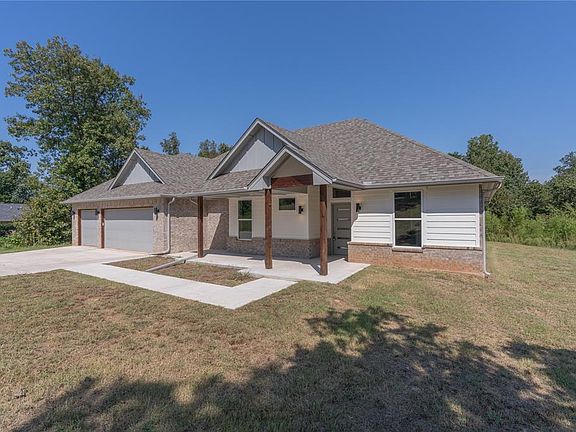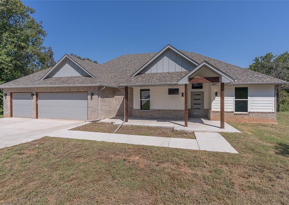 Welcome to this move-in-ready home located in Newalla, offering the perfect blend of serene country living and convenient city access with an easy commute to OKC via I-40. This true 4-bedroom home is situated on a generous 1.05-acre lot, providing ample space and privacy. The home features a three-car garage and a spacious open-concept living area with a cozy corner gas fireplace, a vaulted ceiling, and large windows that fill the space with natural light. The kitchen is a true centerpiece, boasting a large center island with seating, quartz countertops, a built-in electric range, a modern vent hood, and no carpet throughout the home, with wood-look tile flooring. Enjoy meals in the eat-in kitchen area overlooking the covered back patio and sprawling yard. The primary bedroom is a peaceful retreat with a trayed ceiling, a large walk-in closet that conveniently connects to the laundry room, and a luxurious en-suite bath with a spacious tiled walk-in shower and a separate soaking tub. The three additional bedrooms are generously sized and share a full bath, while a half bath off the entry adds convenience for guests. This home offers a perfect combination of modern amenities and a tranquil setting.