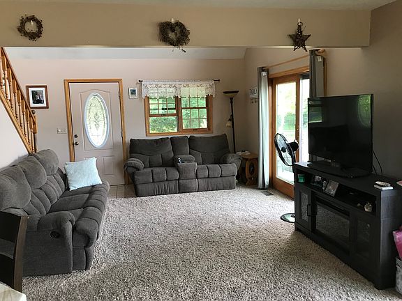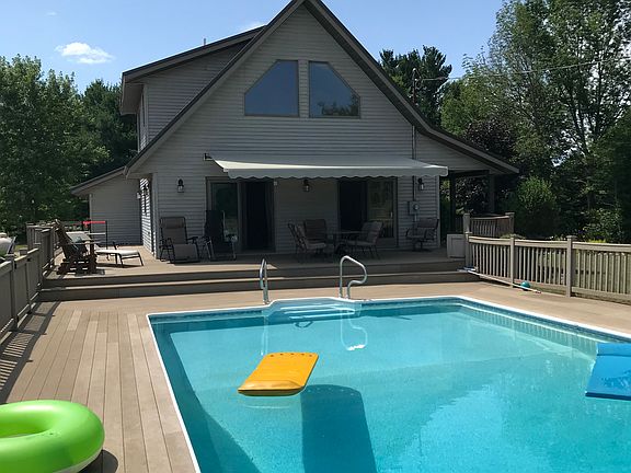 3 story house with 40 x 48 pole barn on 5 acres. Just 3 miles from town with a country setting. Paved driveway with lilacs lining one side. 1000 square feet of composite decking surround the house and 18 x 36 salt water pool. Private setting, can’t see the house from the road in summer. New roof in 2019. Hot tub included, just outside the walk out basement, under the deck. Property is approximately 75% wooded.