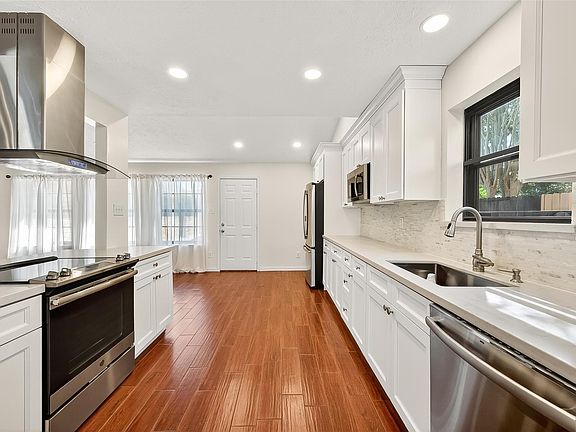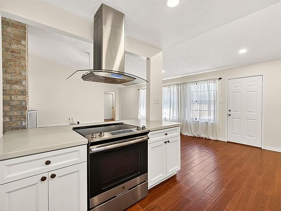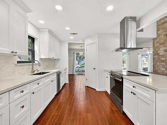 Remarkable turn key opportunity in the Memorial Parkway subdivision. Zoned to well rated Katy schools and located outside the flood plain, this pristine ranch sits upon a quiet, oversized corner lot with mature trees and landscaping. The interior features four generously sized bedrooms, an open concept living area with plentiful natural light throughout. The recently remodeled gourmet white kitchen features high quality quartz countertops, marble backsplash with new cabinets and drawers. Spacious Family Room with gas fireplace and wet bar for entertaining. Woodgrain ceramic tile throughout the living areas. The Primary Bedroom suite features a luxuriously remodeled spa-like bath, with oversized walk in shower and dual vanities. All the big ticket items have been addressed: PEX plumbing throughout the home, HVAC and tankless water heater installed in 2022. Roof installed in 2017. Driveway gate offers additional security and privacy and a 3 car garage. Pride of ownership throughout.